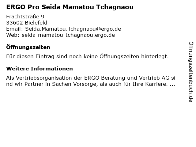 | Öffnungszeiten ERGO Pro Seida Mamatou Tchagnaou in Bielefeld anzeigen | |