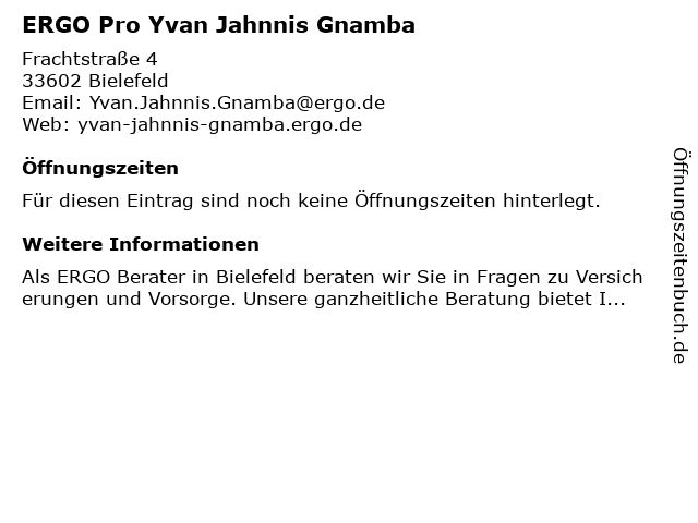 | Öffnungszeiten ERGO Pro Yvan Jahnnis Gnamba in Bielefeld anzeigen | |
