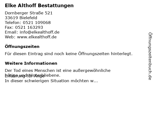 | Öffnungszeiten Elke Althoff Bestattungen in Bielefeld anzeigen | |