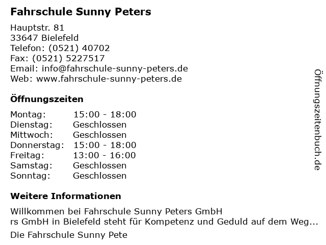 | Öffnungszeiten Fahrschule Sunny Peters in Bielefeld anzeigen | |