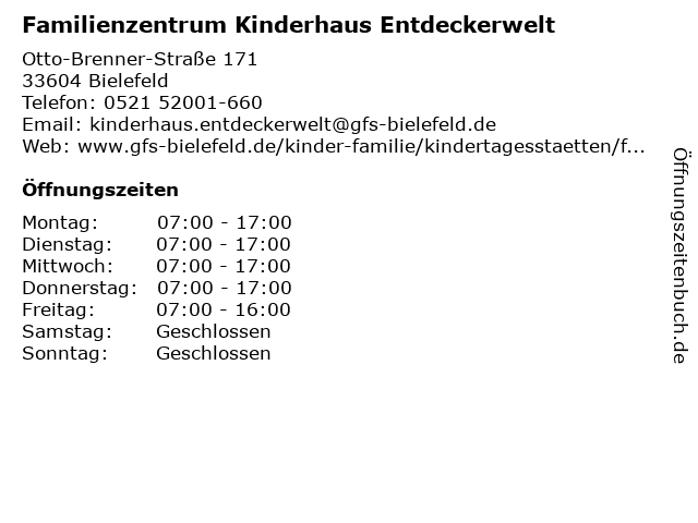 2 Kita/Familienzentrum im Elfriede-Eilers-Zentrum (Entfernung: 0,98 km) Detmolder Str. 280, 33605 Bielefeld 5 JW-Familienzentrum Johannesstift - Kita Pappelhof (Entfernung: 3,69 km) Schildescher Str. 103, 33611 Bielefeld 6 |