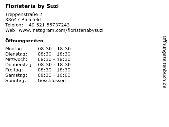 | Öffnungszeiten Floristeria by Suzi in Bielefeld anzeigen | |