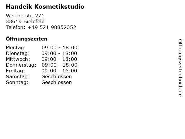 | Öffnungszeiten Handeik Kosmetikstudio in Bielefeld anzeigen | |