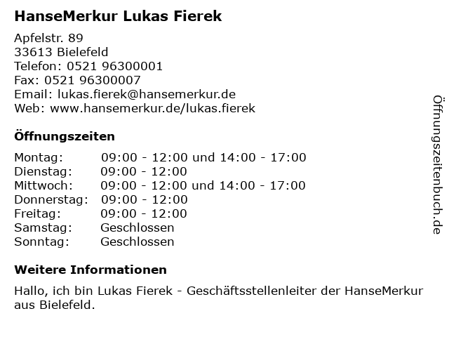 | Öffnungszeiten HanseMerkur Lukas Fierek in Bielefeld anzeigen | |