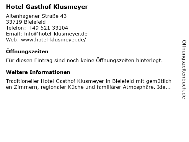 | Öffnungszeiten Hotel Gasthof Klusmeyer in Bielefeld anzeigen | |