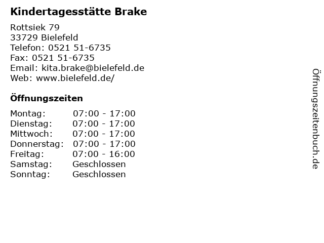 | Öffnungszeiten Kindertagesstätte Brake in Bielefeld anzeigen | |