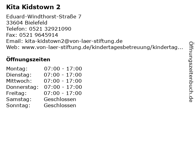 | Öffnungszeiten Kita Kidstown 2 in Bielefeld anzeigen | |