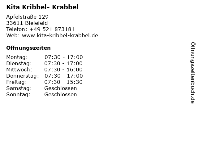 | Öffnungszeiten Kita Kribbel- Krabbel in Bielefeld anzeigen | |