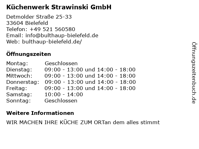 | Öffnungszeiten Küchenwerk Strawinski GmbH in Bielefeld anzeigen | |