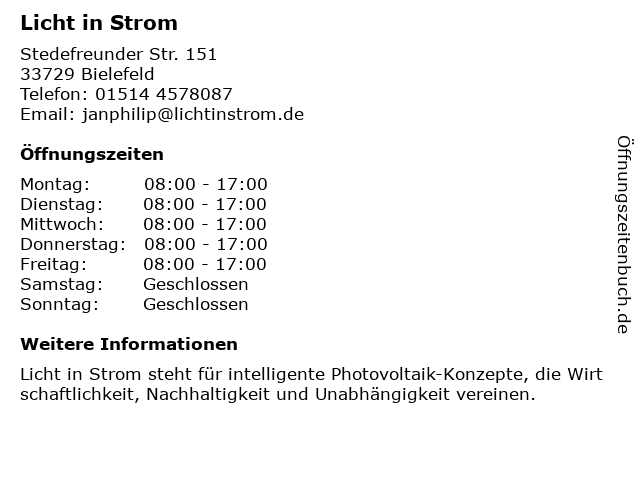 | Öffnungszeiten Licht in Strom in Bielefeld anzeigen | |