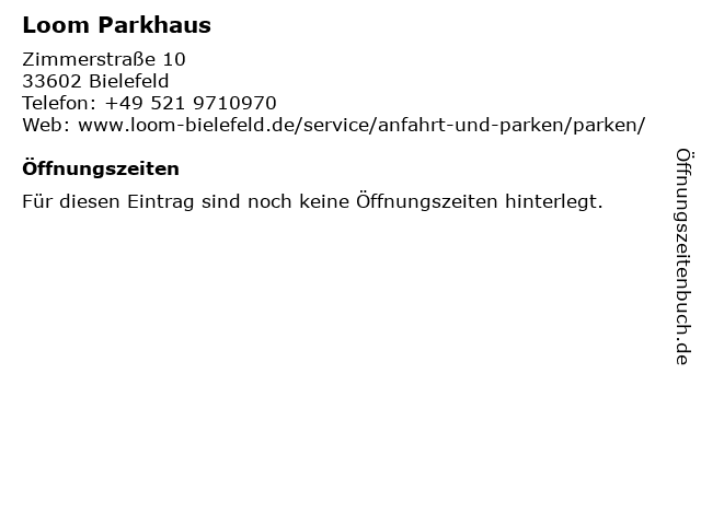 | Öffnungszeiten Loom Parkhaus in Bielefeld anzeigen | |