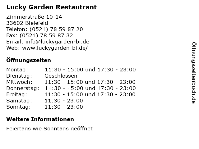 | Öffnungszeiten Lucky Garden Restautrant in Bielefeld anzeigen | |