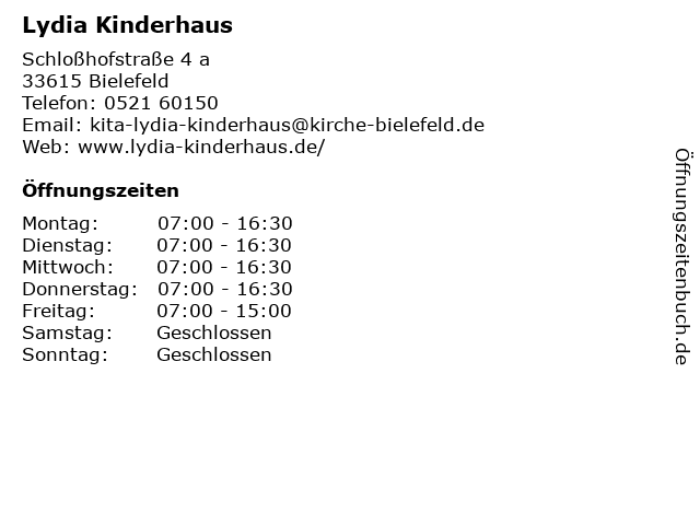 | Öffnungszeiten Lydia Kinderhaus in Bielefeld anzeigen | |