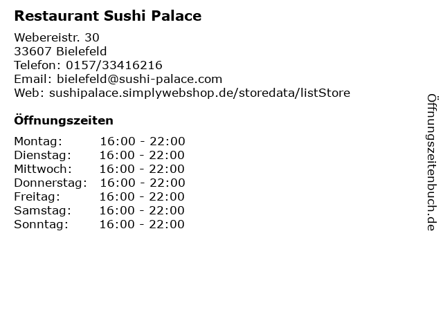 | Öffnungszeiten Restaurant Sushi Palace in Bielefeld anzeigen | |