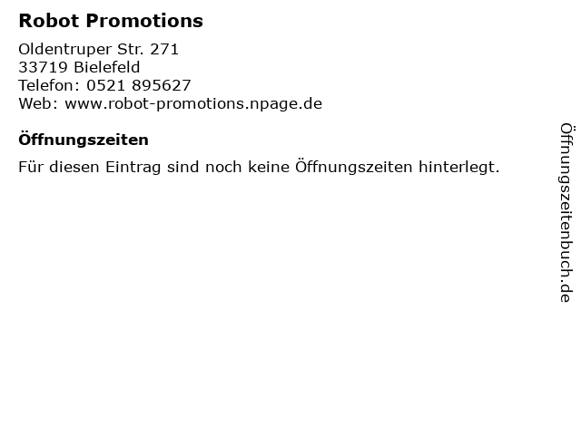 | Öffnungszeiten Robot Promotions in Bielefeld anzeigen | |