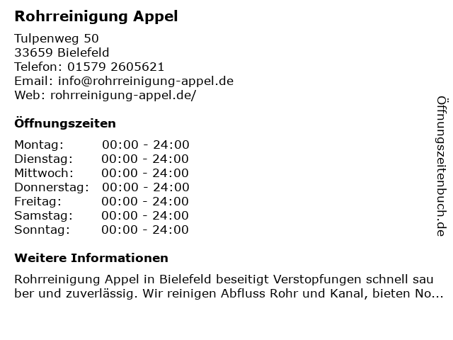 | Öffnungszeiten Rohrreinigung Appel in Bielefeld anzeigen | |