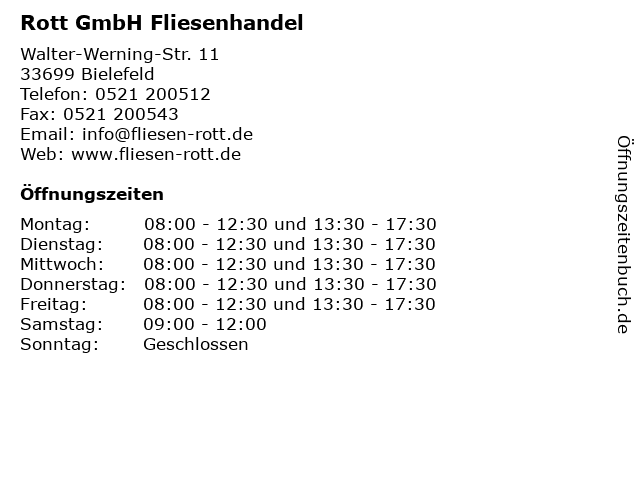 | Öffnungszeiten Rott GmbH Fliesenhandel in Bielefeld anzeigen | |