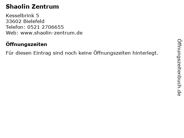 | Öffnungszeiten Shaolin Zentrum in Bielefeld anzeigen | |