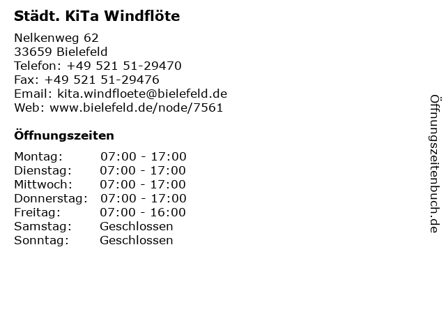 | Öffnungszeiten Städt. KiTa Windflöte in Bielefeld anzeigen | |