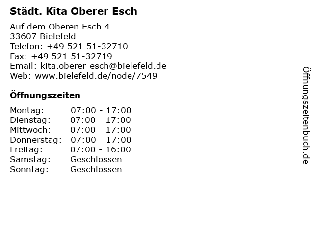 | Öffnungszeiten Städt. Kita Oberer Esch in Bielefeld anzeigen | |