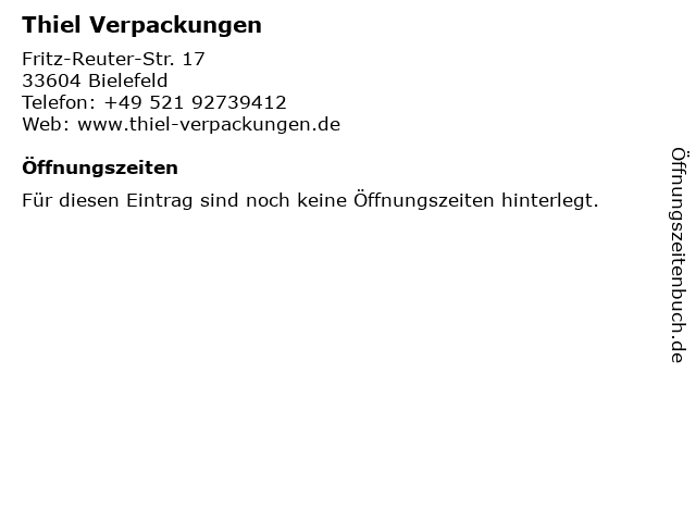 | Öffnungszeiten Thiel Verpackungen in Bielefeld anzeigen | |