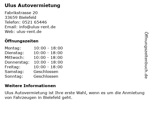 | Öffnungszeiten Ulus Autovermietung in Bielefeld anzeigen | |