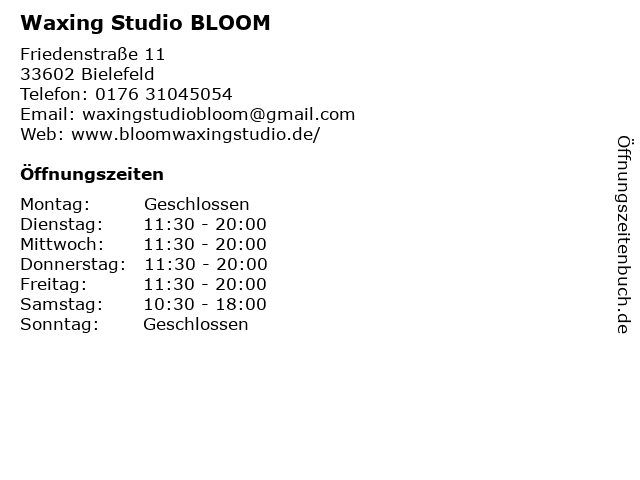 | Öffnungszeiten Waxing Studio BLOOM in Bielefeld anzeigen | |