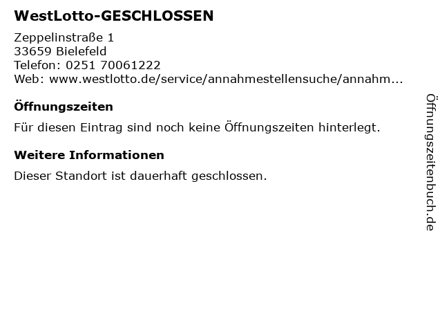Öffnungszeiten WestLotto-GESCHLOSSEN in Bielefeld anzeigen | |
