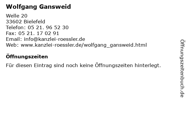 | Öffnungszeiten Wolfgang Gansweid in Bielefeld anzeigen | |