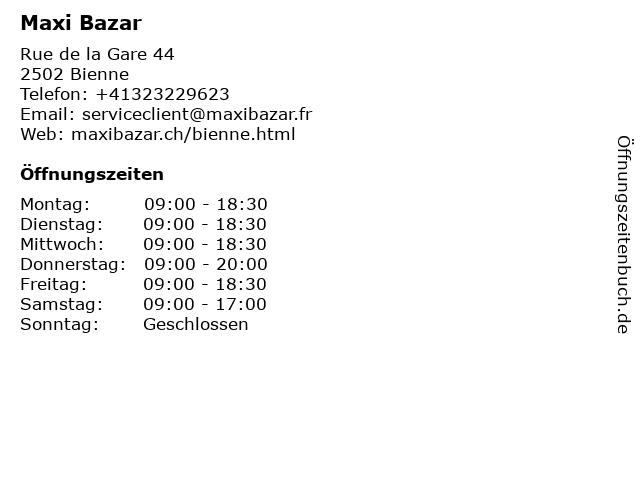 | Öffnungszeiten Maxi Bazar in Bienne anzeigen | |