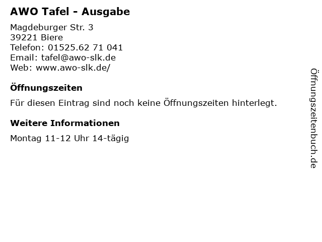 | Öffnungszeiten AWO Tafel - Ausgabe in Biere anzeigen | |