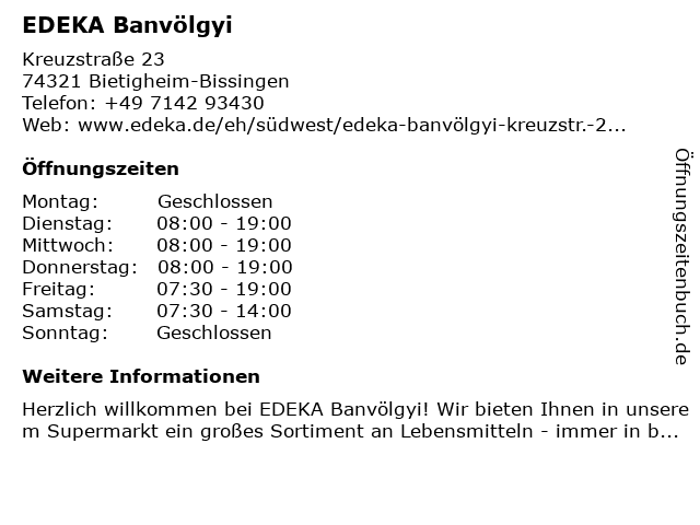| Öffnungszeiten EDEKA Banvölgyi in Bietigheim-Bissingen anzeigen | |