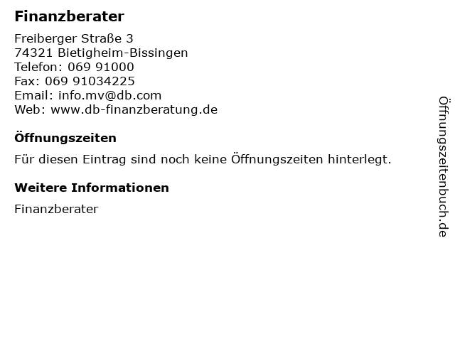 | Öffnungszeiten Finanzberater in Bietigheim-Bissingen anzeigen | |