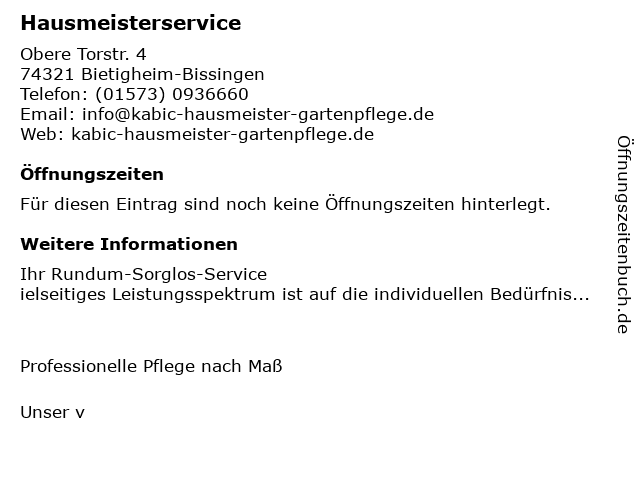1 S.O.S Schlüsselnotdienst ? Hausmeisterservice (Entfernung: 1,74 km) Bahnhofstr. , 74321 Bietigheim-Bissingen 2 3 Preß Peter Hausmeisterservice & Trockenbau Hausmeisterservice (Entfernung: 4,73 km) Goethestr. 4/1, 74379 Ingersheim 4 6  |