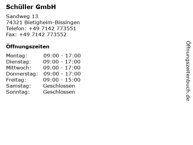 | Öffnungszeiten Schüller GmbH in Bietigheim-Bissingen anzeigen | |