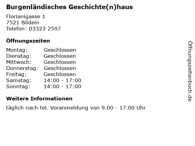 Branchen & Suchbegriffe zu Burgenländisches Geschichte(n)haus:9.00, 17.00, burgenländisches, geschichtenhaus, nach, tel., täglich, uhr, von, voranmeldung |