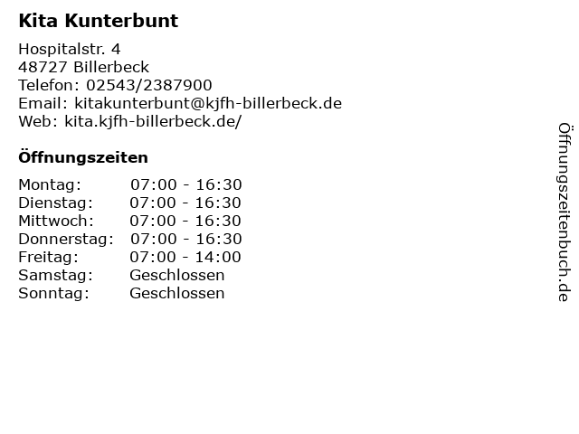 | Öffnungszeiten Kita Kunterbunt in Billerbeck anzeigen | |