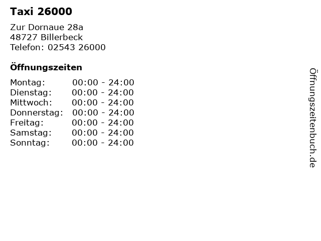 | Öffnungszeiten Taxi 26000 in Billerbeck anzeigen | |