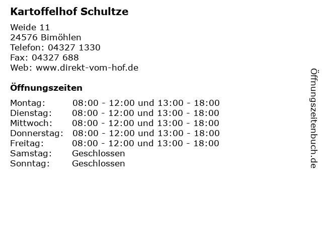 | Öffnungszeiten Kartoffelhof Schultze in Bimöhlen anzeigen | |