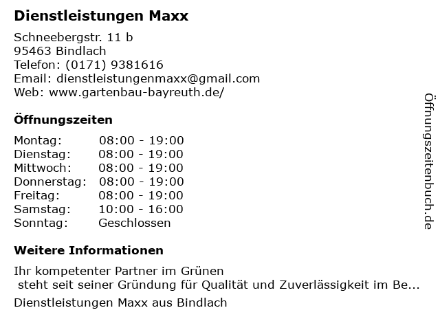 | Öffnungszeiten Dienstleistungen Maxx in Bindlach anzeigen | |