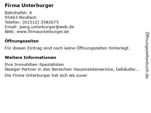 | Öffnungszeiten Firma Unterburger in Bindlach anzeigen | |