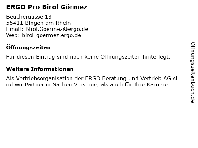 | Öffnungszeiten ERGO Pro Birol Görmez in Bingen am Rhein anzeigen | |