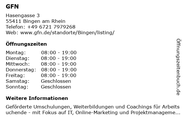 | Öffnungszeiten GFN in Bingen am Rhein anzeigen | |