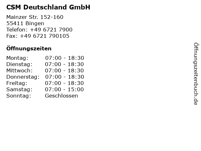 | Öffnungszeiten CSM Deutschland GmbH in Bingen anzeigen | |