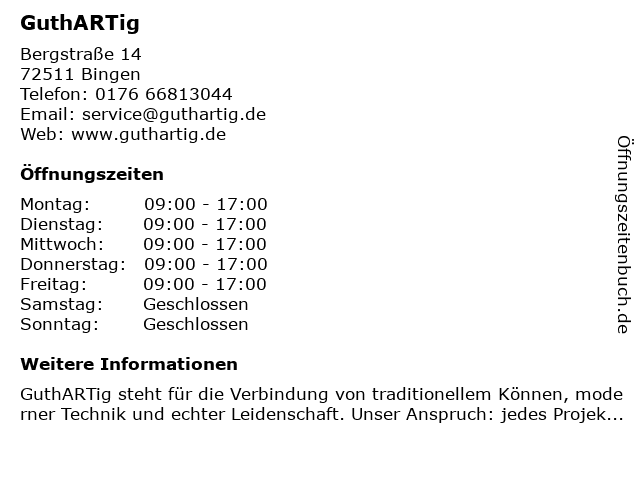 | Öffnungszeiten GuthARTig in Bingen anzeigen | |