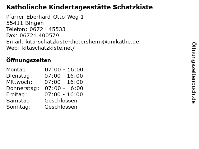 1 Katholische Kindergarten Bingen-Dietersheim (Entfernung: 0,95 km) Sandstraße 33, 55411 Bingen-Dietersheim 5 Katholische Tageseinrichtung für Kinder St. Paulus (Entfernung: 8,61 km) Veit-Stoß-Straße 5, 55218 Ingelheim 6 Katholische Kindertagesstätte St. Gordianus (Ganztagesbetreuung) (Entfernung: 8,96 km) Mainzer Straße 89, 55545 Bad Kreuznach |