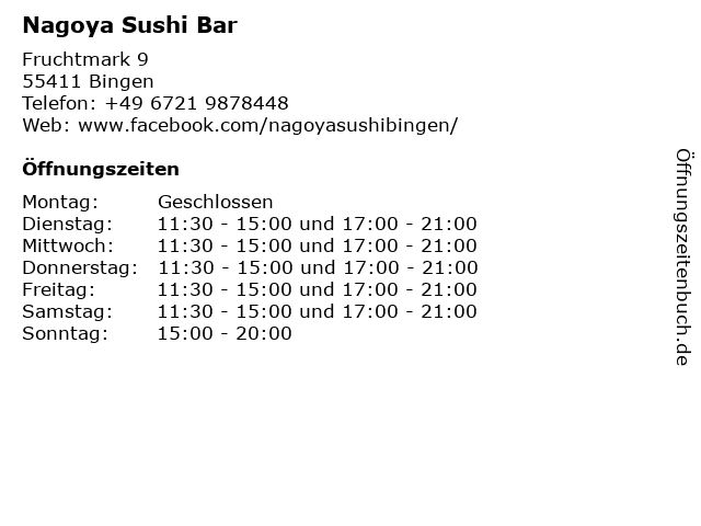 | Öffnungszeiten Nagoya Sushi Bar in Bingen anzeigen | |
