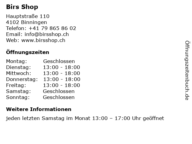 | Öffnungszeiten Birs Shop in Binningen anzeigen | |