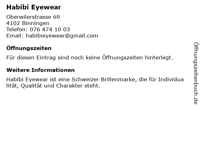 | Öffnungszeiten Habibi Eyewear in Binningen anzeigen | |