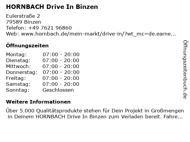 | Öffnungszeiten HORNBACH Drive In Binzen in Binzen anzeigen | |